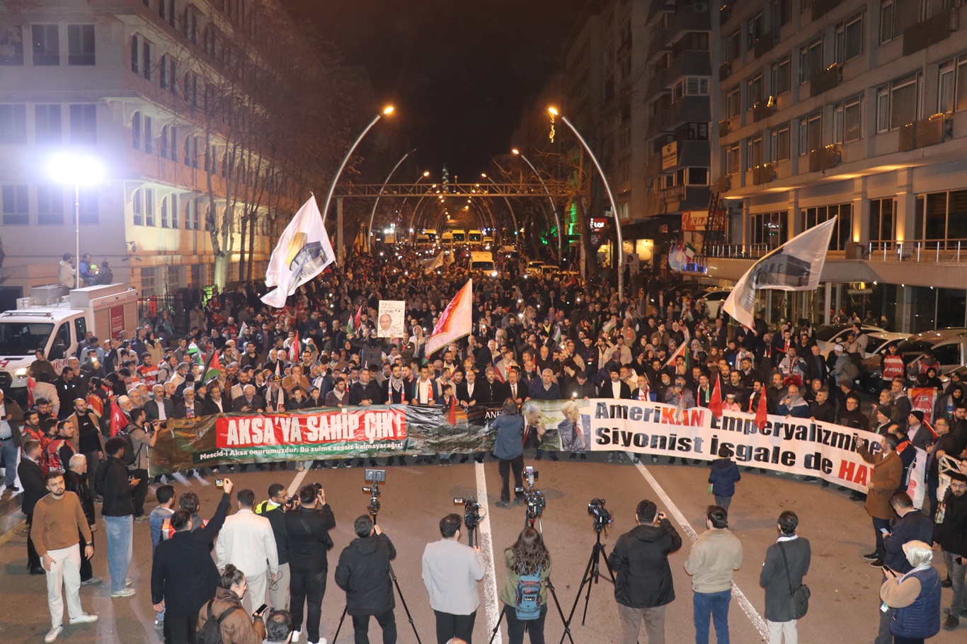 Yürüyüş boyunca katılımcılar, “Ankara’dan Kudüs’e, Filistin’e bin selam”, “Mescid-i Aksa onurumuzdur”, “Katil İsrail, katil ABD”, “Aksa Tufanı siyonizmi yenecek”, “Siyonist katiller hesap verecek”, “Oluk oluk kan aksa, kurtulacak El Aksa” ve “Mescid-i Aksa, müminleri bekliyor” sloganları atarak Filistin’e desteklerini dile getirdi.