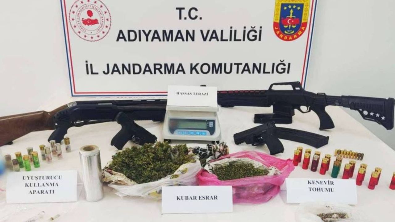 Konu hakkında Valilikten yapılan açıklamada, 'Adıyaman İl Jandarma Komutanlığı unsurlarınca yapılan istihbari çalışmalarda, 19 Aralık 2023 tarihinde 2 ayrı adreste yapılan aramalarda, 2 adet ruhsatsız tabanca, 12 adet tabanca mermisi, 3 adet av tüfeği, 31 adet av tüfeği fişeği, 466 gram kubar esrar, 1 adet hassas terazi, 4 adet uyuşturucu kullanma aparatı, 30 gram kenevir tohumu ele geçirilerek B.Z ve M.Z. isimli şüpheli şahıslar adli makamlara sevk edilmiştir.' denildi. (İLKHA)
