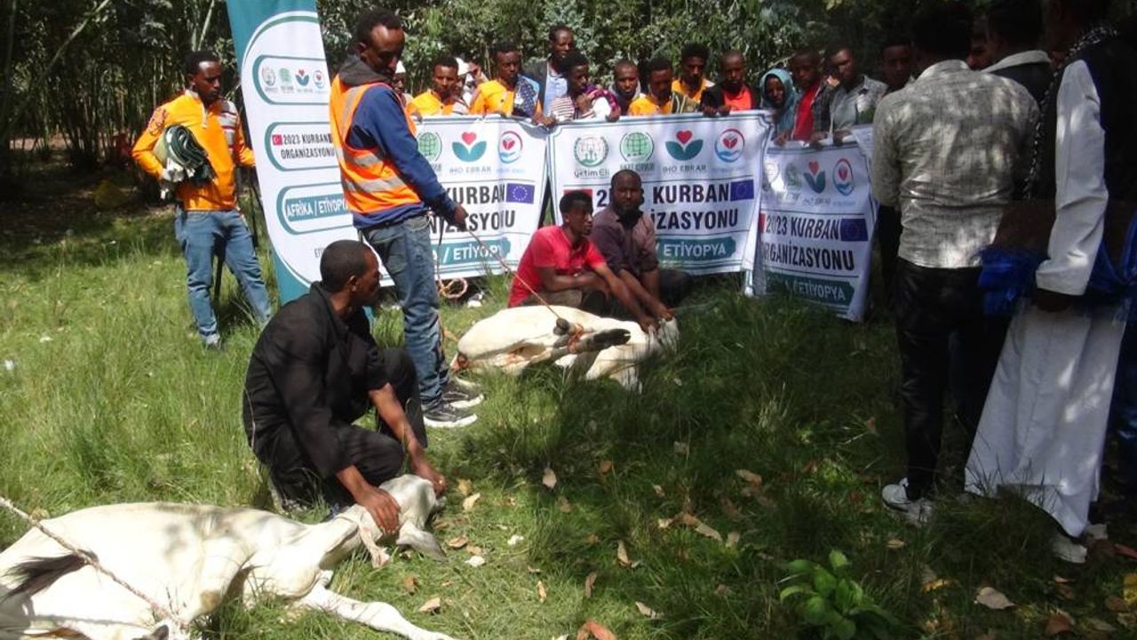 Altun, 'Bugün bayramın birinci günü. Etiyopya'dayız. Avrupa Yetim Eli olarak ekiplerimizle beraber sahadayız. Bayram namazımızı kıldık. Ardından kurban yerlerine gittik. Şu ana kadar yüzlerce kurbanımızı kestik. Hamd olsun, bu kestiğimiz kurbanlardan binlerce, belki de on binlerce yetime, mağdura, muhtaca kırmızı et ulaştırdık.' dedi.