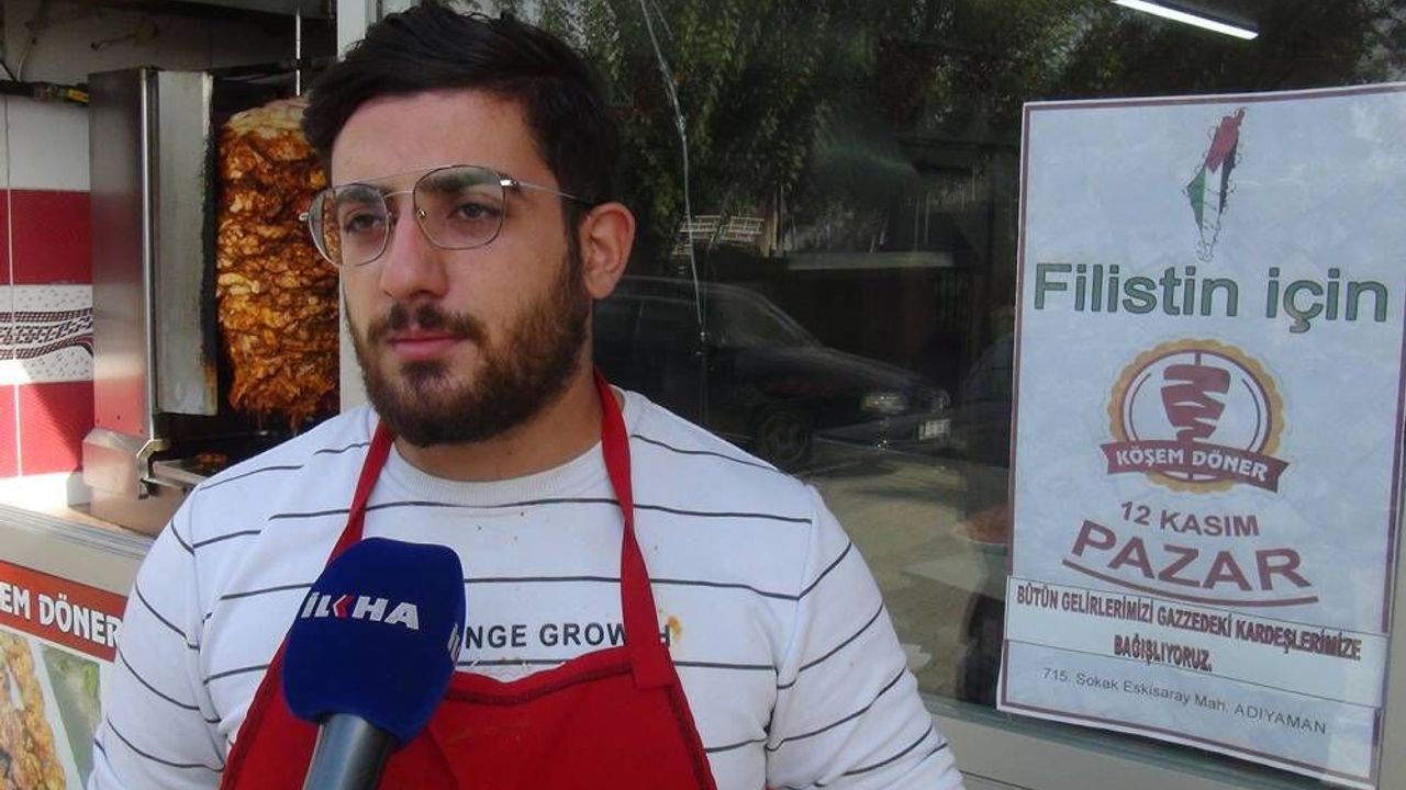 Adıyaman Eskisaray Mahallesi'nde döner satışı yapan esnaf Yusuf Karadağ isimli vatandaş, gün boyu elde edeceği geliri Filistin için bağışlayacağını duyurdu.